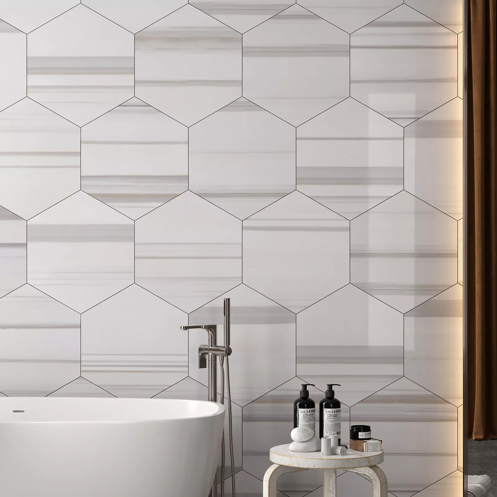 Altıgen Island Dolomit. Arkada epoksi ve file ile uygulanır. Tüm fayanslarımız, nakliye ve taşıma sırasında kırılmaları önlemek için karton kutuludur.